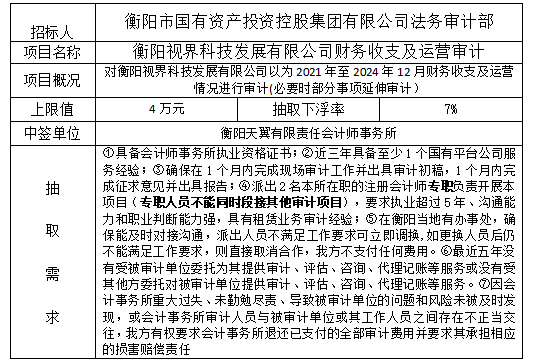 衡陽視界科技發(fā)展有限公司財務(wù)收支及運營審計于2025年10月17日在衡陽國投4棟3樓評標(biāo)室進行了隨機抽取,現(xiàn)將相關(guān)信息予以公示。