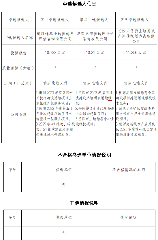 植物園片區(qū)80畝地土地組卷報(bào)批技術(shù)咨詢服務(wù) 于2025年12月4日15時(shí)00分在衡陽國投4棟3樓評(píng)標(biāo)室進(jìn)行了比選開標(biāo)、評(píng)標(biāo)活動(dòng),評(píng)標(biāo)委員會(huì)按照比選文件及相關(guān)法律法規(guī)規(guī)定進(jìn)行評(píng)審,推薦以下三名中選候選人(排序),現(xiàn)將相關(guān)信息予以公示。
